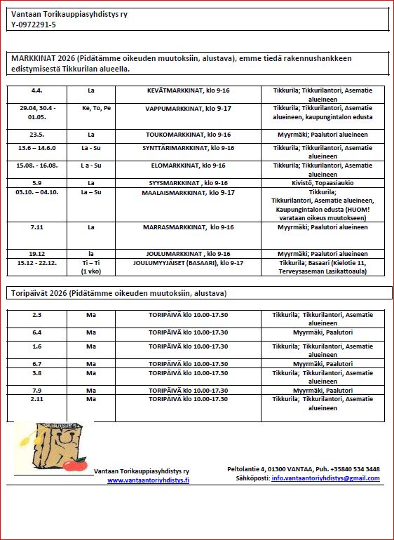 Vantaan Torikauppiasyhdistys ry. Peltolantie 4 01300 Vantaa Email info.vantaantoriyhdistys (at) gmail.com © copyright